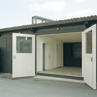 Der Charakter des über 100-jährigen Holzständerbau mit Pultdach sollte erhalten bleiben. Die best. Garagentore erhielten neue Funktionen und wurden gedämmt.